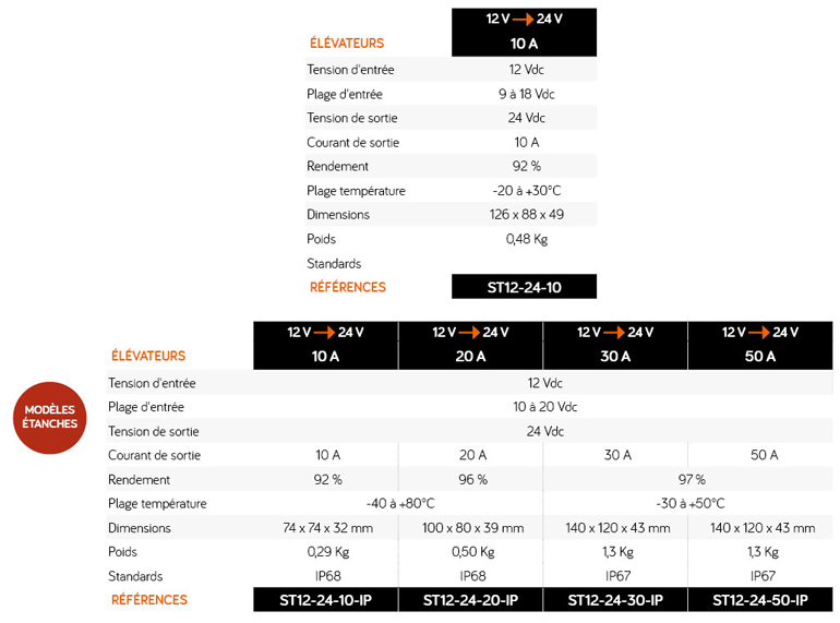Ultra-compacts, les élévateurs de tension 12 V/24 V ST sont protégés contre la surcharge, le court-circuit et la surchauffe et répondent aux normes RoHS et CE.