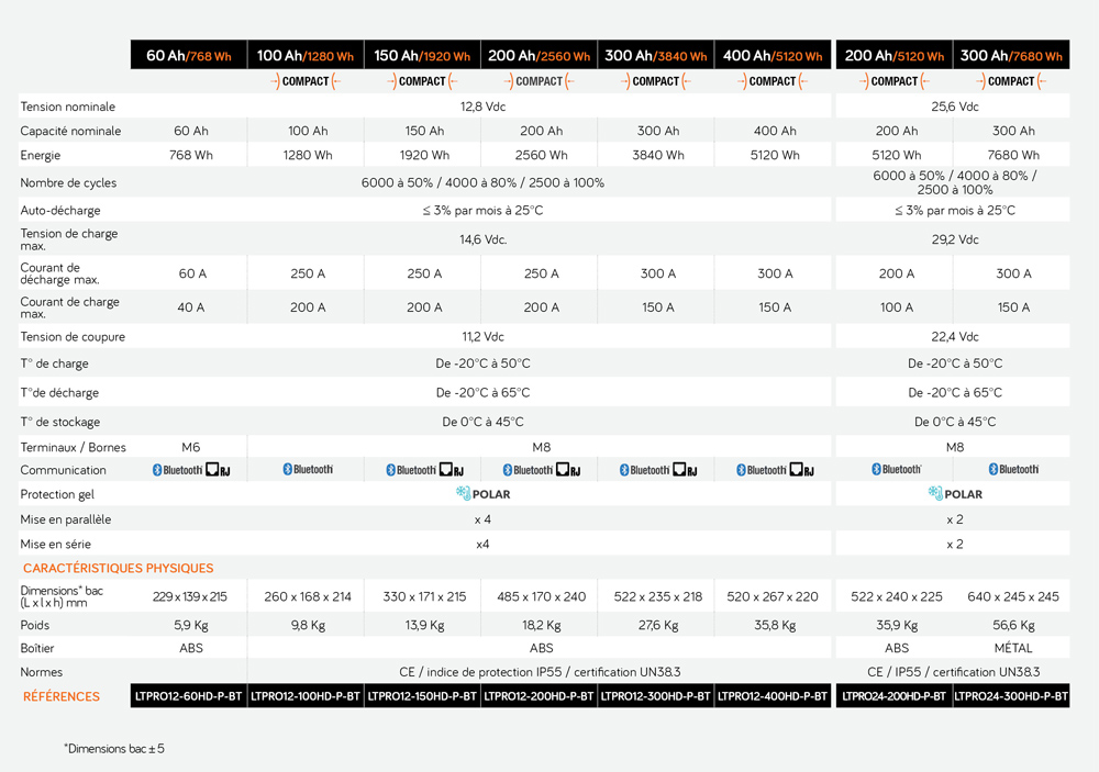 • Elles intègrent des cellules hautes performances ainsi qu’un BMS de 250 A (équivalent à 3000 W permanent) ce qui leur permet de faire fonctionner les consommateurs DC, ou les convertisseurs DC/AC les plus puissants.