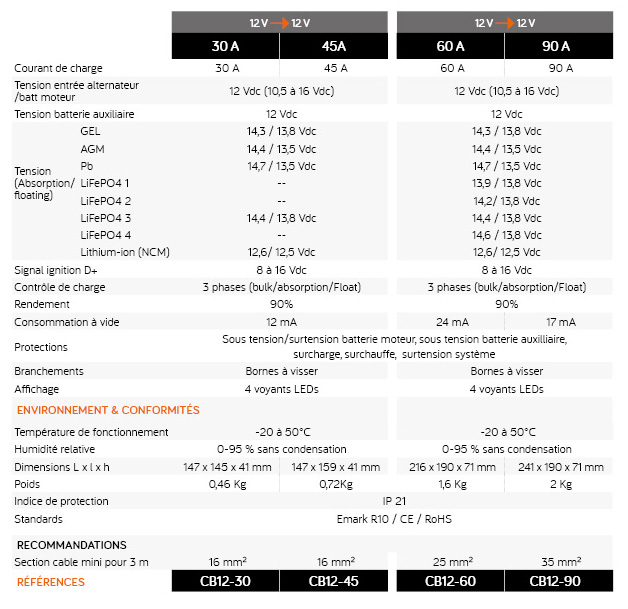 Les chargeurs CB intègrent jusqu’à 8 courbes de charge permettant la recharge de tous les types de batterie. Leur algorithme de charge à 3 étapes assure une charge optimale de la batterie.