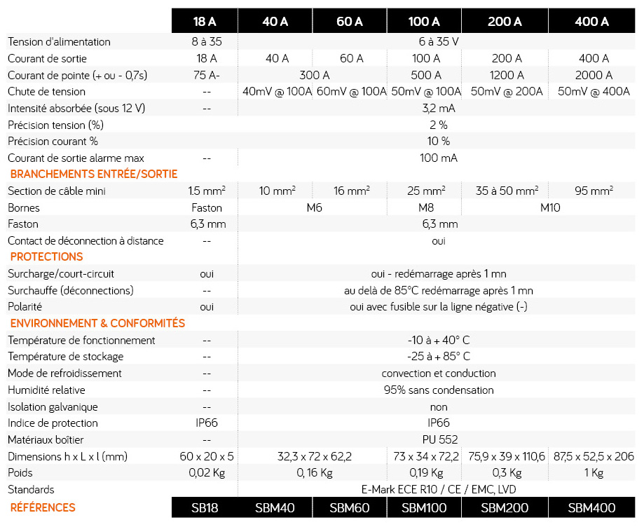 • Les SBM sont dotés d’un micro-processeur qui permet d’obtenir de nombreux seuils de connexion et déconnexion (20 au total). Ils détectent automatiquement la tension sous laquelle fonctionne votre système 12 V ou 24 V. Cinq modèles échelonnés de 40 à 400 A vous permettront de trouver la sauvegarde batterie adaptée à votre application.
