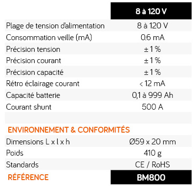 • Véritable jauge d’énergie, le contrôleur de batterie BM800 est un élément indispensable à votre installation électrique. Il vous permettra de visualiser à tout instant la capacité de votre batterie (en %), sa tension (V), ainsi que l’ampérage entrant ou sortant (A) et les ampères/heure (Ah).