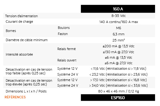 Le coupleur séparateur ESP160 est un commutateur mécanique haute puissance avec détecteur de vibrations intégré destiné à la recharge de 2 batteries distinctes (moteur et auxiliaire) à bord de véhicules, bateaux….